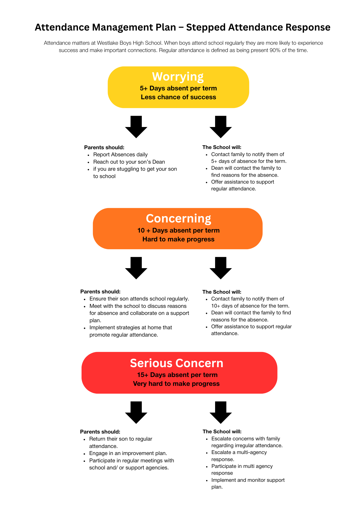At Westlake Boys High School, regular school attendance is vital for student achievement, wellbeing, and belonging to our school community. This Attendance Management Plan reflects our commitment to fostering excellent attendance through collaboration between students, families, and staff.